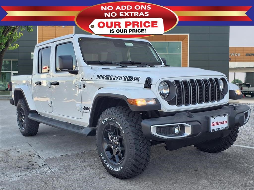 Gillman Chrysler Jeep Dodge Ram is pumped up to offer this outstanding 2025 Jeep Gladiator High Tide in Bright White Clearcoat with Black interior. Well equipped with Convenience Group (Corning Gorilla Glass, Daytime Running Lamp System, Emergency/Assistance Call, Front Door Locks 2-Door Passive Entry, Heated Front Seats, Heated Steering Wheel, Remote Start System, and Universal Garage Door Opener), Quick Order Package 24Q High Tide (97 MPH Vehicle Max Speed Calibration, Advanced Brake Assist, Automatic Headlamps, Body Color 3-Piece Hard Top, Body Color Fender Flares (2-Piece), Deep Tint Sunscreen Windows, Freedom Panel Storage Bag, Full Length Floor Console Premium Armrest, Full Speed Forward Collision Warning Plus, Hard Seat Back, High Tide, High Tide Tailgate & Hood Decals, Integrated Radar Camera Module (IRCM), Leather Wrapped Park Brake Handle, Leather Wrapped Shift Knob, Power 4-Way Driver Lumbar Adjust, Power 4-Way Passenger Lumbar Adjust, Power Adjust 8-Way Driver Seat, Power Adjust 8-Way Front Passenger Seat, Power Heated Mirrors, Premium Door Trim Panel, Premium McKinley Trimmed Seats, Premium Wrapped Steering Wheel, Rear Armrest w/Cupholder Seat, Rear Sliding Window, Rear Window Defroster, Security Alarm, Sun Visors w/Illuminated Vanity Mirrors, Wheels: 17" x 7.5" Painted Black, and Willys Suspension), 110 MPH Vehicle Max Speed Calibration, 12.3" Touchscreen Display, 3.73 Rear Axle Ratio, 4-Wheel Disc Brakes, 4G LTE Wi-Fi Hot Spot, 8 Speakers, ABS brakes, Air Conditioning, Alexa Built-In, AM/FM radio: SiriusXM, Apple CarPlay, Apple CarPlay/Android Auto, Brake assist, Cloth Low-Back Bucket Seats, Compass, Connectivity - US/Canada, Delay-off headlights, Driver door bin, Driver vanity mirror, Dual front impact airbags, Dual front side impact airbags, Electronic Stability Control, Front anti-roll bar, Front Bucket Seats, Front Center Armrest w/Storage, Front fog lights, Front License Plate Bracket, Front reading lights, Google Android Auto, Illuminated entry, Integrated roll-over protection, Low tire pressure warning, Normal Duty Suspension, Occupant sensing airbag, Outside temperature display, Overhead airbag, Panic alarm, ParkView Rear Back-Up Camera, Passenger door bin, Passenger vanity mirror, Power steering, Power windows, Radio data system, Radio: Uconnect 5 w/12.3" Display, Rear anti-roll bar, Rear reading lights, Remote keyless entry, Side Steps, Speed control, Split folding rear seat, Steering wheel mounted audio controls, Tachometer, Telescoping steering wheel, Tilt steering wheel, Traction control, Trip computer, USB Host Flip, Variably intermittent wipers, Voltmeter, and Wheels: 17" x 7.5" Black Steel Styled.