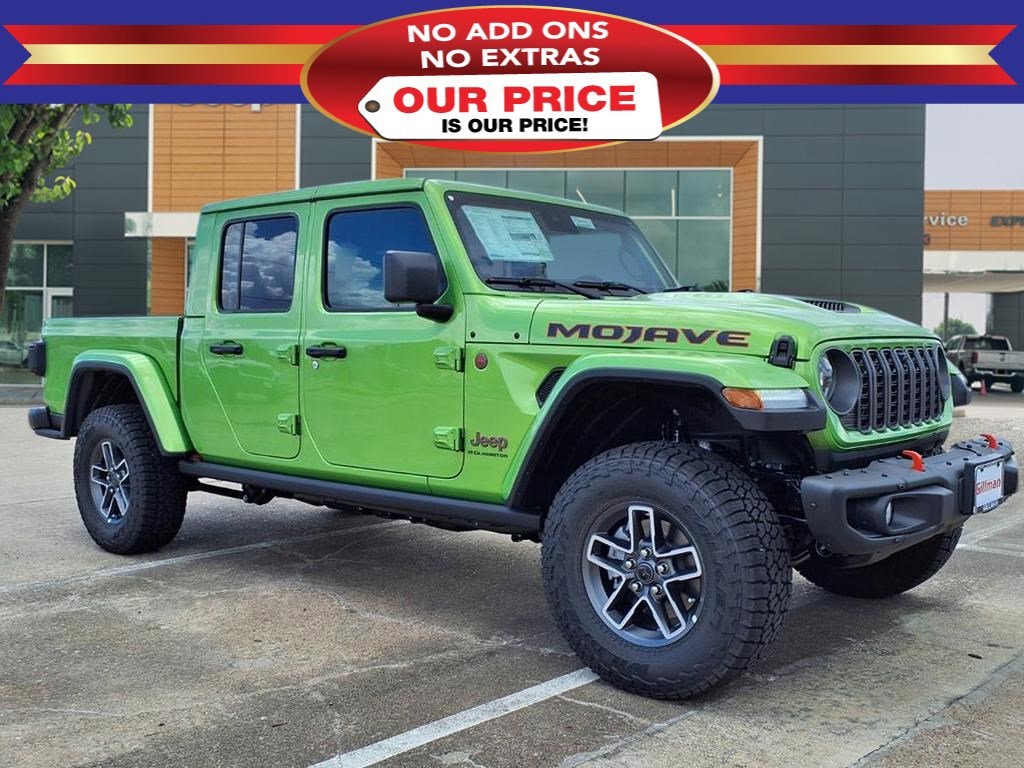 Gillman Chrysler Jeep Dodge Ram is honored to offer this attractive 2025 Jeep Gladiator Mojave in Mojito with Black interior. Well equipped with Quick Order Package 24A Mojave X (4G LTE Wi-Fi Hot Spot, Alexa Built-In, Alpine Premium Audio System, Apple CarPlay, Auto High Beam Headlamp Control, Auto-Dimming Rear-View Mirror, Blind Spot & Cross Path Detection, Bluetooth Wireless Speaker, Body Color 3-Piece Hard Top, Body Color Rubicon Highline Flare, Connected Travel & Traffic Services, Connectivity - US/Canada, Freedom Panel Storage Bag, Full Length Floor Console Premium Armrest, Google Android Auto, GPS Navigation, Heated Front Seats, Heated Steering Wheel, Integrated Off-Road Camera, Integrated Voice Command w/Bluetooth, Leather Trimmed Bucket Seats, Leather Wrapped Park Brake Handle, Leather Wrapped Shift Knob, MOPAR Hardtop Headliner, No Soft Top, ParkSense Rear Park Assist System, Power 4-Way Driver Lumbar Adjust, Power 4-Way Passenger Lumbar Adjust, Power Adjust 8-Way Driver Seat, Power Adjust 8-Way Front Passenger Seat, Premium Door Trim Panel, Radio: Uconnect 5 Nav w/12.3" Display, Rear Armrest w/Cupholder Seat, Rear Sliding Window, Rear Window Defroster, SiriusXM Radio Service, SiriusXM w/360L, Steel Front Bumper, Steel Rear Bumper, Universal Garage Door Opener, and USB Host Flip), 12.3" Touchscreen Display, 4-Wheel Disc Brakes, 4.10 Rear Axle Ratio, 8 Speakers, 97 MPH Vehicle Max Speed Calibration, ABS brakes, Air Conditioning, Alloy wheels, AM/FM radio: SiriusXM, Apple CarPlay/Android Auto, Automatic temperature control, Brake assist, Compass, Delay-off headlights, Driver door bin, Driver vanity mirror, Dual front impact airbags, Dual front side impact airbags, Electronic Stability Control, Emergency communication system: Jeep Connect, Front anti-roll bar, Front Bucket Seats, Front Center Armrest w/Storage, Front dual zone A/C, Front fog lights, Front License Plate Bracket, Front reading lights, Fully automatic headlights, Heated door mirrors, Heavy Duty Suspension w/Gas Shocks, Illuminated entry, Integrated roll-over protection, Low tire pressure warning, MOPAR All-Weather Slush Mats, MOPAR Spray In Bedliner, Occupant sensing airbag, Outside temperature display, Overhead airbag, Panic alarm, Passenger door bin, Passenger vanity mirror, Power door mirrors, Power steering, Power windows, Premium Cloth Seats w/Sport Bolsters, Radio data system, Radio: Uconnect 5 w/12.3" Display, Rear anti-roll bar, Rear reading lights, Remote keyless entry, Security system, Speed control, Split folding rear seat, Steering wheel mounted audio controls, Tachometer, Telescoping steering wheel, Tilt steering wheel, Traction control, Trip computer, Variably intermittent wipers, Voltmeter, and Wheels: 17" x 7.5" Dark Gray Painted.