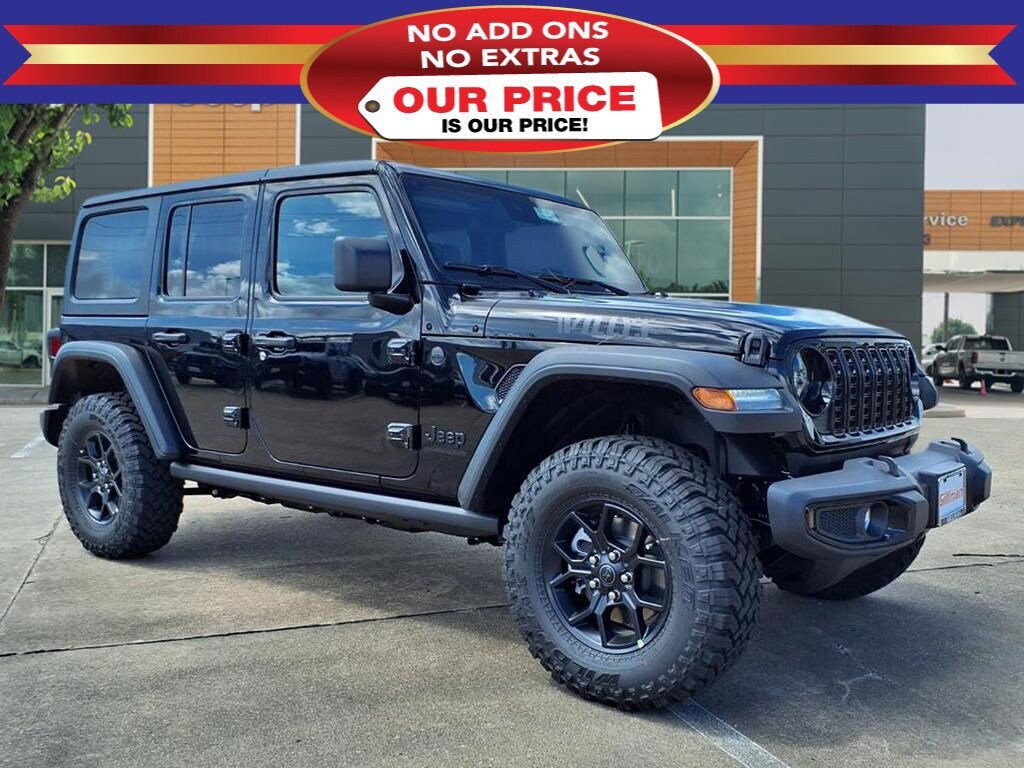 Gillman Chrysler Jeep Dodge Ram is pumped up to offer this attractive 2025 Jeep Wrangler Willys in Black Clearcoat with Black interior. Well equipped with Convenience Group (2-Door Passive Entry, Front Door Locks, Air Conditioning w/Auto Temperature Control, Air Filtering, Cluster 7.0" TFT Color Display, Emergency/Assistance Call, Heated Front Seats, Heated Steering Wheel, Remote Start System, and Universal Garage Door Opener), Quick Order Package 24W Willys (4-Wheel Drive Swing Gate Decal, 7 & 4 Pin Wiring Harness, 97 MPH Vehicle Max Speed Calibration, Advanced Brake Assist, Automatic Headlamps, Auxiliary Switches, Black Grille, Class II Receiver Hitch, Conventional Differential Front Axle, Corning Gorilla Glass, Dana M210 Wide HD Tube Front Axle, Dana M220 Wide Rear Axle, Daytime Running Lamps LED Accents, Deep Tint Sunscreen Windows, E-Locker Rear Axle, Enhanced Adaptive Cruise Control, Front LED Fog Lamps, Full Speed Forward Collision Warning Plus, Injection Molded Black Rear Bumper, LED Premium Reflector Headlamps, Mold In Color Bumper w/Gloss Black, Molded in Color Rubicon Highline Flare, MOPAR All-Weather Floor Mats, Off-Road Plus Mode, Power Heated Mirrors, Premium Wrapped Steering Wheel, Security Alarm, Sun Visors w/Illuminated Vanity Mirrors, Wheels: 17" x 7.5" Painted Black, Willy's Suspension, and Willys Hood Decal), 110 MPH Vehicle Max Speed Calibration, 4-Wheel Disc Brakes, 8 Speakers, ABS brakes, Air Conditioning, AM/FM radio: SiriusXM, Apple CarPlay/Android Auto, Aux Battery, Black 3-Piece Hard Top, Brake assist, Cloth Low-Back Bucket Seats, Compass, Delay-off headlights, Driver door bin, Driver vanity mirror, Dual front impact airbags, Dual front side impact airbags, Electronic Stability Control, Freedom Panel Storage Bag, Front anti-roll bar, Front Bucket Seats, Front Center Armrest w/Storage, Front fog lights, Front reading lights, Illuminated entry, Integrated roll-over protection, Low tire pressure warning, Non-Lock Fuel Cap w/o Discriminator, Normal Duty Suspension, Occupant sensing airbag, Outside temperature display, Overhead airbag, Panic alarm, ParkView Rear Back-Up Camera, Passenger door bin, Passenger vanity mirror, Power steering, Power windows, Radio data system, Radio: Uconnect 5 w/12.3" Display, Rear anti-roll bar, Rear reading lights, Rear Window Defroster, Rear Window Wiper/Washer, Remote keyless entry, Speed control, Split folding rear seat, Steering wheel mounted audio controls, Stop-Start Dual Battery System, Tachometer, Telescoping steering wheel, Tilt steering wheel, Traction control, Trip computer, Variably intermittent wipers, and Wheels: 17" x 7.5" Black Steel Styled.