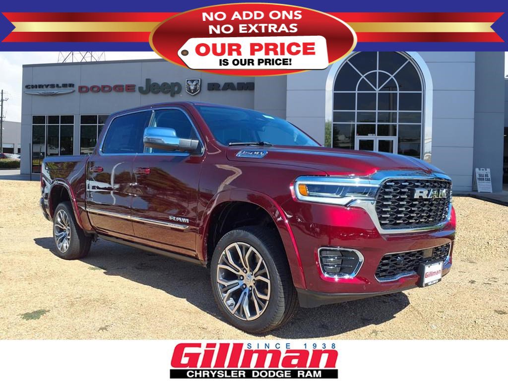Gillman Chrysler Jeep Dodge Ram is pleased to offer this fantastic-looking 2026 Ram 1500 Tungsten in Delmonico Red Pearlcoat with Black interior. Well equipped with Bed Utility Group (Exterior 115V AC Outlet, MOPAR 4 Adjustable Cargo Tie-Down Hooks, and Truck Bed Cargo Divider), Quick Order Package 22V Tungsten, 12-Way/1-Way Trailer Connector, 3.92 Rear Axle Ratio, 4-Wheel Disc Brakes, ABS brakes, Adjustable pedals, Air Conditioning, Alloy wheels, AM/FM radio, Apple CarPlay/Android Auto, Audio memory, Auto High-beam Headlights, Auto Power-Folding Mirrors, Auto-dimming door mirrors, Auto-Dimming Exterior Driver Mirror, Auto-dimming Rear-View mirror, Auto-leveling suspension, Automatic temperature control, Bodyside moldings, Brake assist, Bumpers: body-color, Chrome Exterior Mirrors, Compass, Delay-off headlights, Driver door bin, Driver vanity mirror, Dual front impact airbags, Dual front side impact airbags, Electronic Stability Control, Exterior Mirrors Courtesy Lamps, Exterior Mirrors w/Heating Element, Exterior Mirrors w/Memory, Exterior Mirrors w/Supplemental Signals, Exterior Parking Camera Rear, Front anti-roll bar, Front Bucket Seats, Front Center Armrest w/Storage, Front dual zone A/C, Front fog lights, Front License Plate Bracket, Front reading lights, Front wheel independent suspension, Fully automatic headlights, Garage door transmitter, Heads-Up Display, Heated door mirrors, Heated front seats, Heated rear seats, Heated steering wheel, Illuminated entry, Leather steering wheel, Low tire pressure warning, Memory seat, Multi-Function Tailgate, MyFlexCare Service Plan, Navigation System, Occupant sensing airbag, Outside temperature display, Overhead airbag, Overhead console, Panic alarm, Passenger door bin, Passenger vanity mirror, Pedal memory, Power adjustable front head restraints, Power door mirrors, Power driver seat, Power moonroof, Power passenger seat, Power steering, Power windows, Premium Leather Bucket Seats, Radio data system, Radio: Uconnect 5 Nav w/14.4" Display, Rain sensing wipers, RAM's Head Badge, Rear anti-roll bar, Rear reading lights, Rear seat center armrest, Rear step bumper, Rear window defroster, Remote keyless entry, Remote Tailgate Release, Security system, Speed control, Split folding rear seat, Steering wheel mounted audio controls, Tachometer, Telescoping steering wheel, Tilt steering wheel, Traction control, Trailer Brake Control, Trip computer, Turn signal indicator mirrors, Variably intermittent wipers, Ventilated front seats, Ventilated rear seats, Voltmeter, and Wheels: 22" x 9" Polish/Painted w/Inserts.