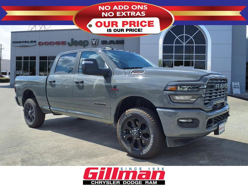 Gillman Chrysler Jeep Dodge Ram is pleased to offer this fantastic 2026 Ram 2500 Big Horn in Ceramic Gray Clearcoat with Black interior. Well equipped with Big Horn Level 1 Plus Equipment Group (12" Touchscreen Display, 2 Way Rear Headrest Seat, 2nd Row In Floor Storage Bins, 4 Way Front Headrests, 40/20/40 Split Bench Seat, 4G LTE Wi-Fi Hot Spot, 9 Alpine Speakers w/Subwoofer, Air Conditioning ATC w/Dual Zone Control, Alexa Built-In, Anti-Spin Differential Rear Axle, Apple CarPlay, Auto Power-Folding Mirrors, Auto-Dimming Rear-View Mirror, Black Exterior Mirrors, Connected Travel & Traffic Services, Connectivity - US/Canada, Disassociated Touchscreen Display, Dual Glove Boxes, Emergency Vehicle Alert System (EVAS), Exterior Mirrors Courtesy Lamps, Exterior Mirrors w/Heating Element, Exterior Mirrors w/Supplemental Signals, Foam Bottle Insert (Door Trim Panel), Folding Flat Load Floor Storage, Footwell Courtesy Lamp, For Details, Visit DriveUconnect.com, For More Info, Call 800-643-2112, Forward & Reverse Utility Lights, Front Armrest w/Cupholders, Front Center Seat Cushion Storage, Front Seat Back Map Pockets, Global Telematics Box Module (TBM), Glove Box Lamp, Google Android Auto, GPS Antenna Input, GPS Navigation, HD Radio, Integrated Voice Command w/Bluetooth, LED Bed Lighting, Locking Lower Glove Box, Luxury Steering Wheel, Manual Adjust 4-Way Front Passenger Seat, Mirror Running Lights, MOPAR Deployable Bed Step, MOPAR Spray In Bedliner, Off-Road Info Pages, Power 2-Way Driver Lumbar Adjust, Power Adjust 8-Way Driver Seat, Power Adjust Mirrors, Power Heated Folding Telescopic Mirrors, Power Telescoping Mirrors, Power-Adjustable Convex Aux Mirrors, Premium Cloth 40/20/40 Bench Seat, Radio: Uconnect 5 Nav w/12.0" Display, Rear 60/40 Folding Seat, Rear Dome w/On/Off Switch Lamp, Remote Start System, Remote USB Port - Charge Only, Selectable Tire Fill Alert, SiriusXM Radio Service, SiriusXM w/360L, Steering Wheel Mounted Audio Controls, Storage Tray, and Trailer Tow Pages), Heated Seats & Wheel Group (Heated Front Seats and Heated Steering Wheel), Night Edition (Black Exterior Truck Badging, Black Interior Accents, Black Wheel Center Hub, Body Color Grille-Surround, Gloss Black Nostrils/Mic Black Grille, Painted Front Bumper, Painted Rear Bumper, and Wheels: 20" x 8.0" Black Painted Aluminum), Quick Order Package 24Y Lone Star (Regional) (Lone Star Badge), 4-Wheel Disc Brakes, 5th Wheel/Gooseneck Towing Prep Group, 6 Speakers, ABS brakes, Air Conditioning, Alloy wheels, AM/FM radio: SiriusXM, Apple CarPlay/Android Auto, Brake assist, Bumpers: chrome, Center Hub, Clearance Lamps, Cloth 40/20/40 Bench Seat, Compass, Delay-off headlights, Driver door bin, Dual front impact airbags, Dual front side impact airbags, Electronic Stability Control, Front anti-roll bar, Front Center Armrest w/Storage, Front fog lights, Front License Plate Bracket, Front reading lights, Fully automatic headlights, Heated door mirrors, Illuminated entry, Low tire pressure warning, Manual Adjust 4-Way Driver Seat, MOPAR Front & Rear Rubber Floor Mats, Occupant sensing airbag, Outside temperature display, Overhead airbag, Overhead console, Panic alarm, ParkView Rear Back-Up Camera, Passenger door bin, Passenger vanity mirror, Power door mirrors, Power steering, Power windows, Radio data system, Radio: Uconnect 5 w/8.4" Display, Rear anti-roll bar, Rear Folding Seat, Rear seat center armrest, Rear step bumper, Rear Wheelhouse Liners, Rear window defroster, Remote keyless entry, Security system, Speed control, Tachometer, Tilt steering wheel, Traction control, Trip computer, Turn signal indicator mirrors, Variably intermittent wipers, Voltmeter, and Wheels: 18" x 8.0" Polished AluminuM.