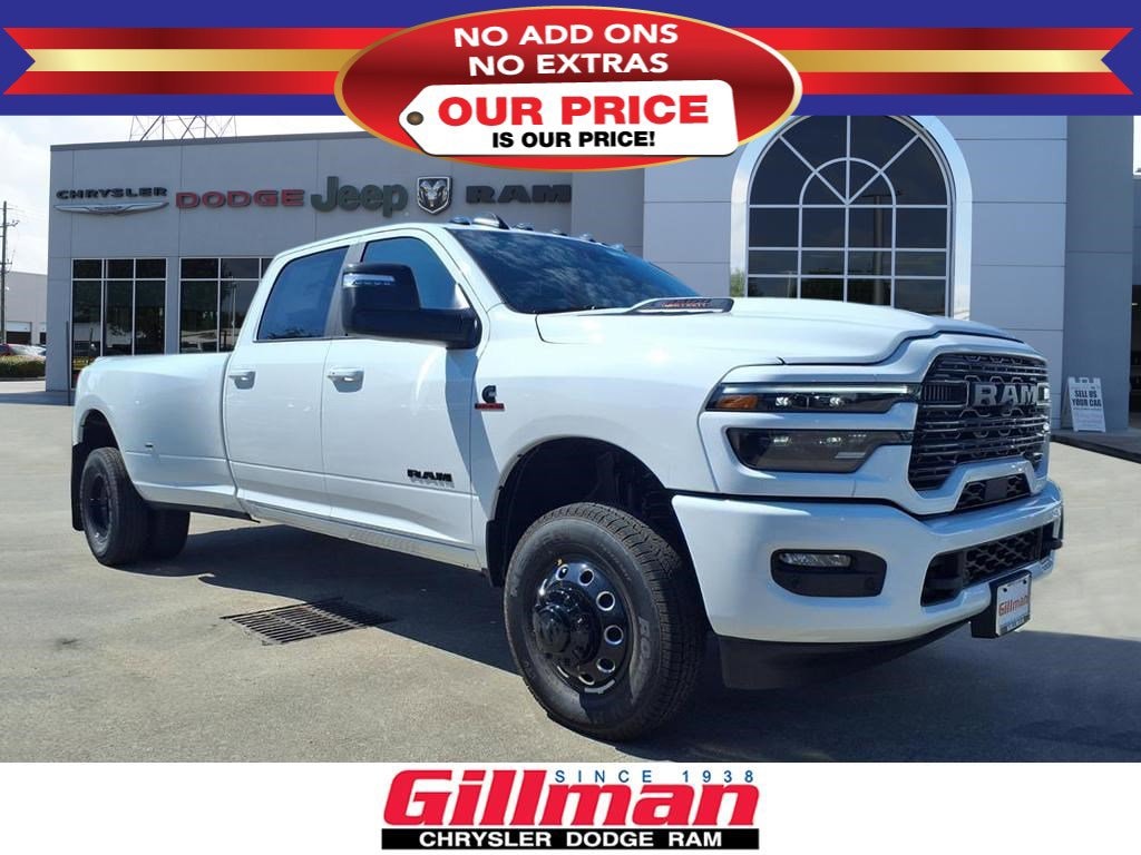 Gillman Chrysler Jeep Dodge Ram is honored to offer this good-looking 2026 Ram 3500 Laramie in Bright White Clearcoat with Black interior. Well equipped with Laramie Level 1 Plus Equipment Group (#1 Seat Foam Cushion, 115V Auxiliary Rear Power Outlet, 2 Way Rear Headrest Seat, 2nd Row In Floor Storage Bins, 4 Way Front Headrests, Active Lane Management System, Adaptive Steering System, Auto Adjust In Reverse Exterior Mirrors, Auto Dimming Exterior Passenger Mirror, Auto High Beam Headlamp Control, Auto Power-Folding Mirrors, Auto-Dimming Exterior Mirrors, Bucket Seats, Chrome Exterior Mirrors, CTR Stop Lamp w/Cargo View Camera, Drowsy Driver Detection, Dual Wireless Charging Pad, Exterior Mirrors Courtesy Lamps, Exterior Mirrors w/Heating Element, Exterior Mirrors w/Memory, Exterior Mirrors w/Supplemental Signals, Foam Bottle Insert (Door Trim Panel), Folding Flat Load Floor Storage, Forward & Reverse Utility Lights, Front Seat Back Map Pockets, Full Length Upgraded Floor Console, Heated Front Seats, Heated Steering Wheel, High Back Seats, Leather Trimmed Bucket Seats, LED Bed Lighting, Mirror Running Lights, MOPAR Deployable Bed Step, MOPAR Spray In Bedliner, Power 2-Way Driver Lumbar Adjust, Power 2-Way Passenger Lumbar Adjust, Power Adjust 8-Way Driver Seat, Power Adjust 8-Way Front Passenger Seat, Power Adjust Mirrors, Power Adjustable Pedals w/Memory, Power Heat Fold Memory Telescopic Mirrors, Power Telescoping Mirrors, Power-Adjustable Convex Aux Mirrors, Rain Sensitive Windshield Wipers, Rear 60/40 Folding Seat, Remote Tailgate Release, and Traffic Sign Recognition), Night Edition (Black Exterior Mirrors, Black Exterior Truck Badging, Black Wheel Center Hub, Body Color Grille Surround, Gloss Black Grille Billets/Accents, and Sport Performance Hood), Quick Order Package 24H Laramie, 10 Speakers, 4-Wheel Disc Brakes, 4G LTE Wi-Fi Hot Spot, 50 Gallon Fuel Tank, 5th Wheel/Gooseneck Towing Prep Group, 6000# Front Axle w/Hub Ext, ABS brakes, Air Conditioning, Alexa Built-In, Alloy wheels, AM/FM radio: SiriusXM with 360L, Apple CarPlay, Apple CarPlay/Android Auto, Auto Level Rear Air Suspension, Auto-dimming Rear-View mirror, Automatic temperature control, Box & Rear Fender Clearance Lamps, Brake assist, Bumpers: body-color, Center Hub, Clearance Lamps, Compass, Connected Travel & Traffic Services, Connectivity - US/Canada, Dash Pass Thru Wire Circuits, Delay-off headlights, Delete Deployable Bed Step, Disassociated Touchscreen Display, Driver door bin, Driver vanity mirror, Dual front impact airbags, Dual front side impact airbags, Dual Rear Wheels, Electronic Stability Control, Emergency Vehicle Alert System (EVAS), Front anti-roll bar, Front Center Armrest w/Storage, Front dual zone A/C, Front fog lights, Front License Plate Bracket, Front reading lights, Fully automatic headlights, Garage door transmitter, Global Telematics Box Module (TBM), Google Android Auto, GPS Antenna Input, GPS Navigation, HD Radio, Heated door mirrors, Heated front seats, Heated steering wheel, I/P Mounted Auxiliary Switches, Illuminated entry, Integrated Voice Command w/Bluetooth, Leather Trim 40/20/40 Bench Seat, Low tire pressure warning, MOPAR Front & Rear Rubber Floor Mats, Navigation System, Nexen Brand Tires, Occupant sensing airbag, Off-Road Information Pages, Outside temperature display, Overhead airbag, Overhead console, Panic alarm, ParkView Rear Back-Up Camera, Passenger door bin, Passenger vanity mirror, Power door mirrors, Power driver seat, Power passenger seat, Power steering, Power windows, Radio data system, Radio: Uconnect 5 Nav w/12.0" Display, Rear reading lights, Rear seat center armrest, Rear step bumper, Rear window defroster, Remote keyless entry, Security system, Selectable Tire Fill Alert, SiriusXM Radio Service, SiriusXM w/360L, Speed control, Split folding rear seat, Steering wheel mounted audio controls, Tachometer, Tilt steering wheel, Traction control, Trailer Tow Pages, Trip computer, Turn signal indicator mirro